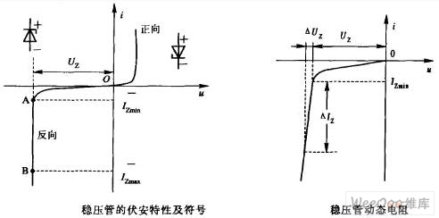 穩(wěn)壓管也是一種晶體二極管,它是利用PN結(jié)的擊穿區(qū)具有穩(wěn)定電壓的特性來(lái)工作的。穩(wěn)壓管在穩(wěn)壓設(shè)備和一些電子電路中獲得廣泛的應(yīng)用。我們把這種類(lèi)型的二極管稱(chēng)為穩(wěn)壓管,以區(qū)別用在整流、檢波和其他單向?qū)щ妶?chǎng)合的二極管。如圖畫(huà)出了穩(wěn)壓管的伏安特性及其符號(hào)。
