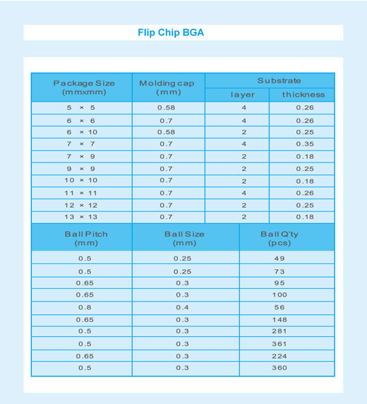 高密度、低弧高(40um)、窄間距(50um)打線(xiàn),Spacer技術(shù),倒裝芯片技術(shù)(突塊高度70um/80um/100um),芯片堆疊,密間距植球技術(shù)(球徑250um,球間距400um)。